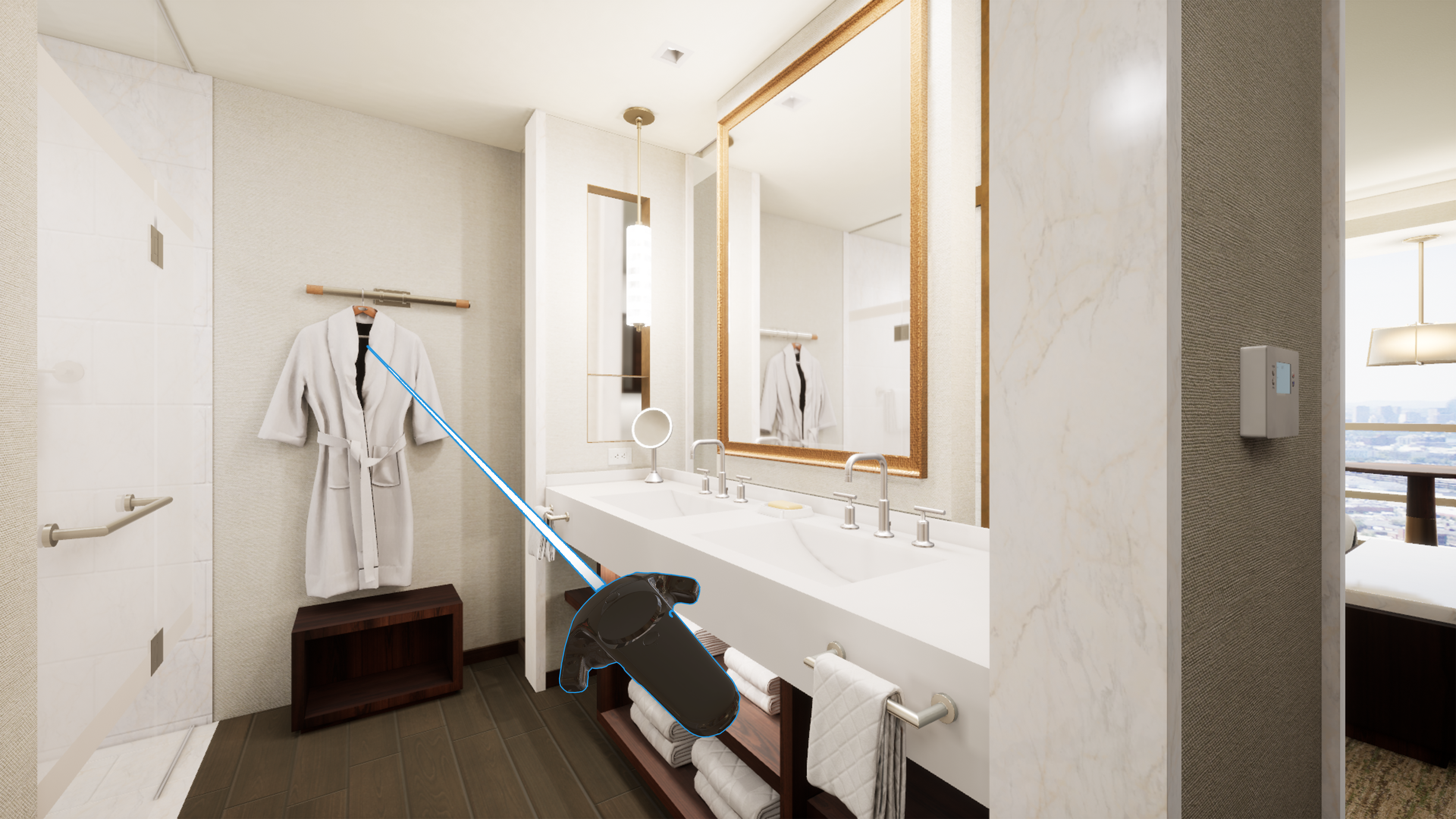 The review process extended well beyond room layouts. Sightlines across the 13.5-acre pool complex were evaluated. Backlit hallway panels were revised after being seen in context. Hoist sizing for bathtub installation was confirmed in VR before delivery.